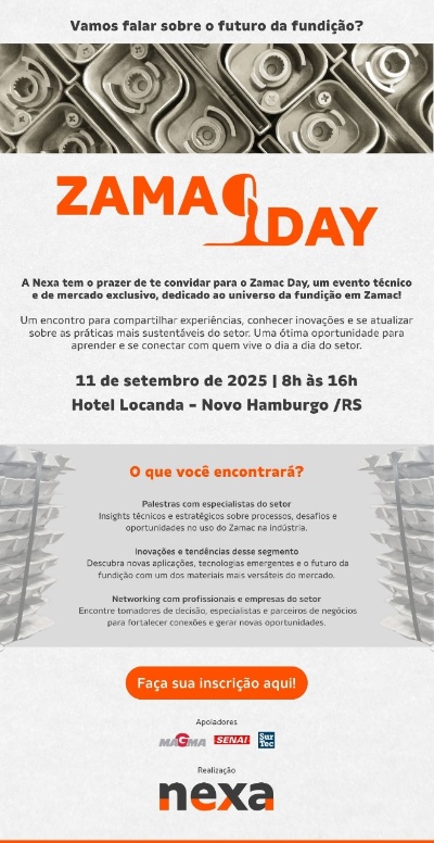 A Nexa, com o apoio da MAGMA, convida você para o Zamac Day, um evento técnico e de mercado exclusivo, totalmente voltado ao universo da fundição em Zamac.